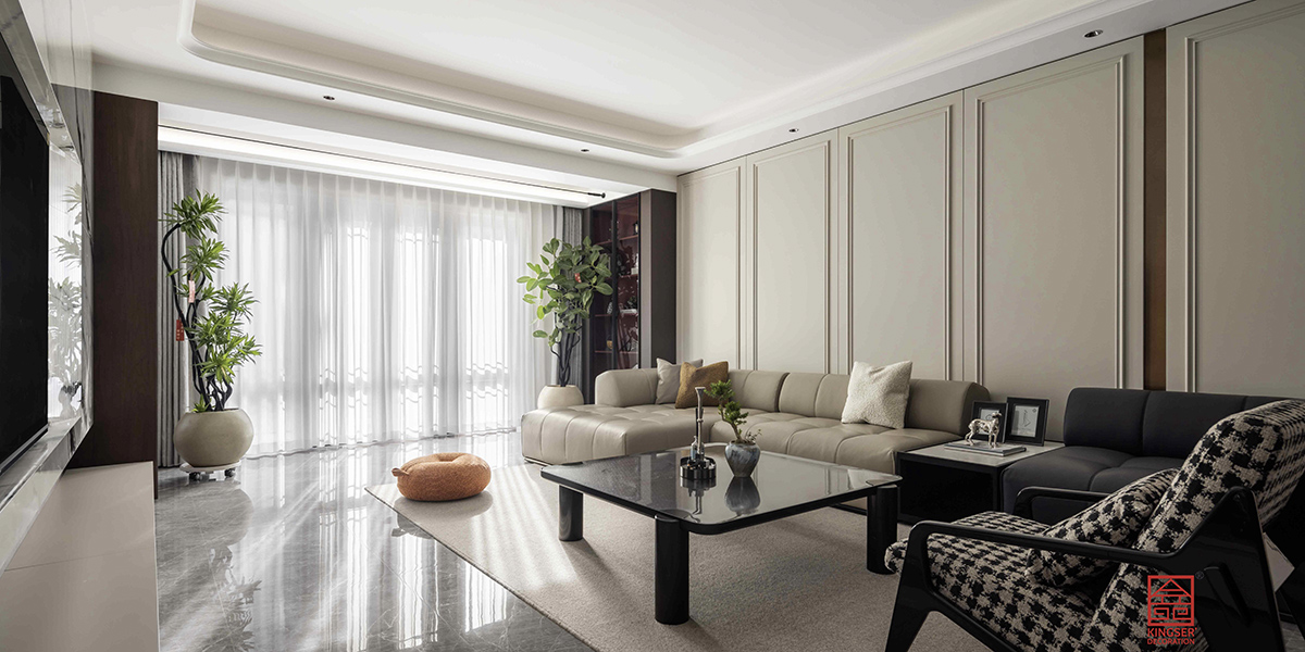 客廳采用磁吸軌道無主燈設計+定制燈帶,以舒適合理的線條,引領室內氛圍光,拉伸層高,擴充格局,讓業主真正感受私人訂制設計之美。